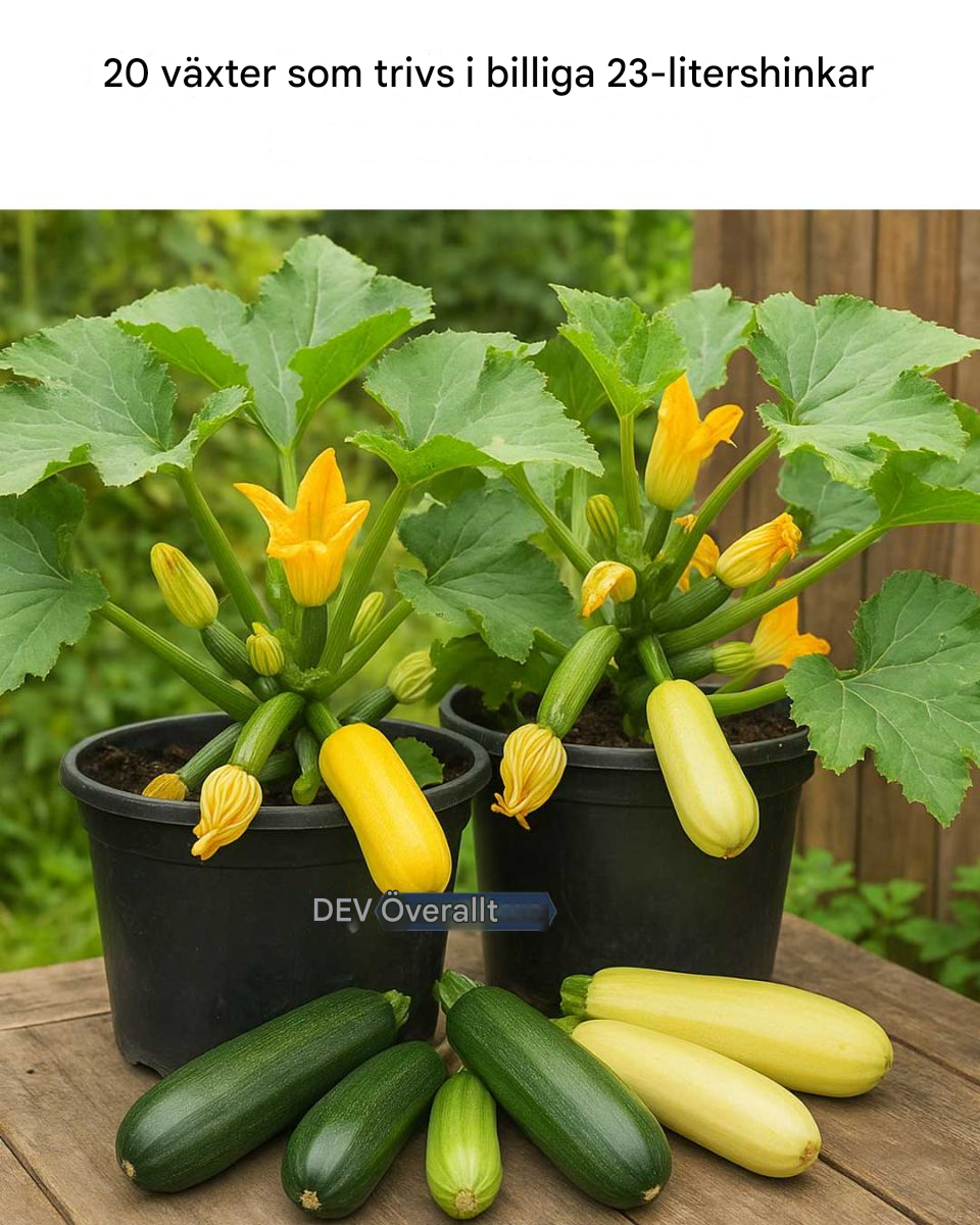 Zucchini är produktiva producenter och trivs bra i 20-liters hinkar. Välj busksorter som är mer kompakta och lämpliga för krukodling. Se till att hinkarna placeras på en solig plats och vattna regelbundet. Zucchini växer snabbt, så var beredd att skörda ofta för att uppmuntra kontinuerlig produktion.