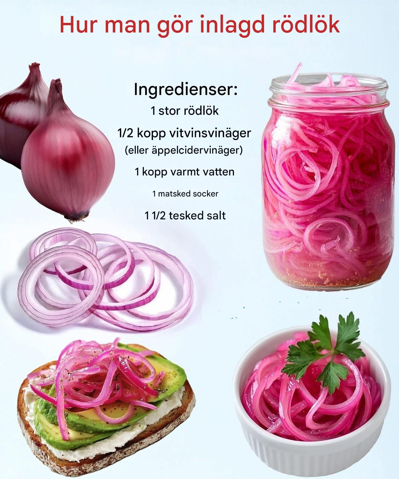 Ingredienser: 1 stor rödlök, tunt skivad 1/2 dl äppelcidervinäger 1/2 dl vatten 1 msk strösocker 1 1/2 tsk salt Valfria tillsatser: 1 vitlöksklyfta (krossad), 1/2 tsk svartpepparkorn, 1 lagerblad eller lite rödpepparflingor (för hetta)IngrediensboxarLökförvaring Instruktioner: fortsättning på nästa sida