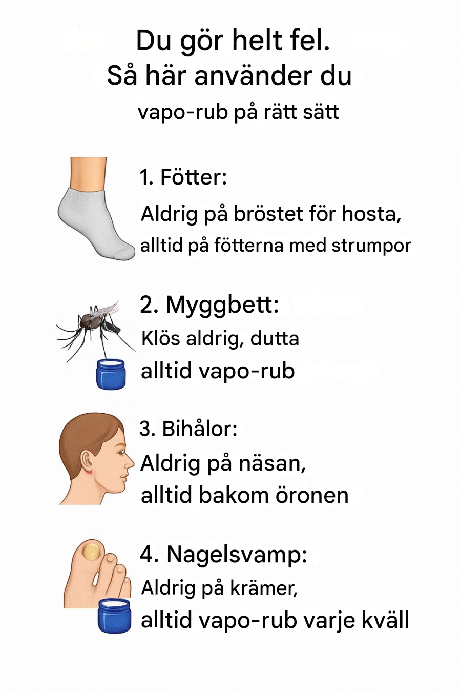 Vapo Rub, en basvaruprodukt i generationer, har ofta använts för att lindra symtom på förkylningar och hosta. Men många använder den felaktigt och missar dess fulla potential. Även om den mentolhaltiga salvan ofta appliceras på bröstet finns det ett rätt sätt att maximera dess fördelar som många inte är medvetna om. I den här artikeln fördjupar vi oss i vanliga missbruk av Vapo Rub och presenterar vetenskapligt underbyggda metoder för att förbättra dess effektivitet. Från att lindra hosta till att behandla myggbett, upptäck hur du använder Vapo Rub korrekt och lås upp dess överraskande användningsområden utöver traditionella tillämpningar.