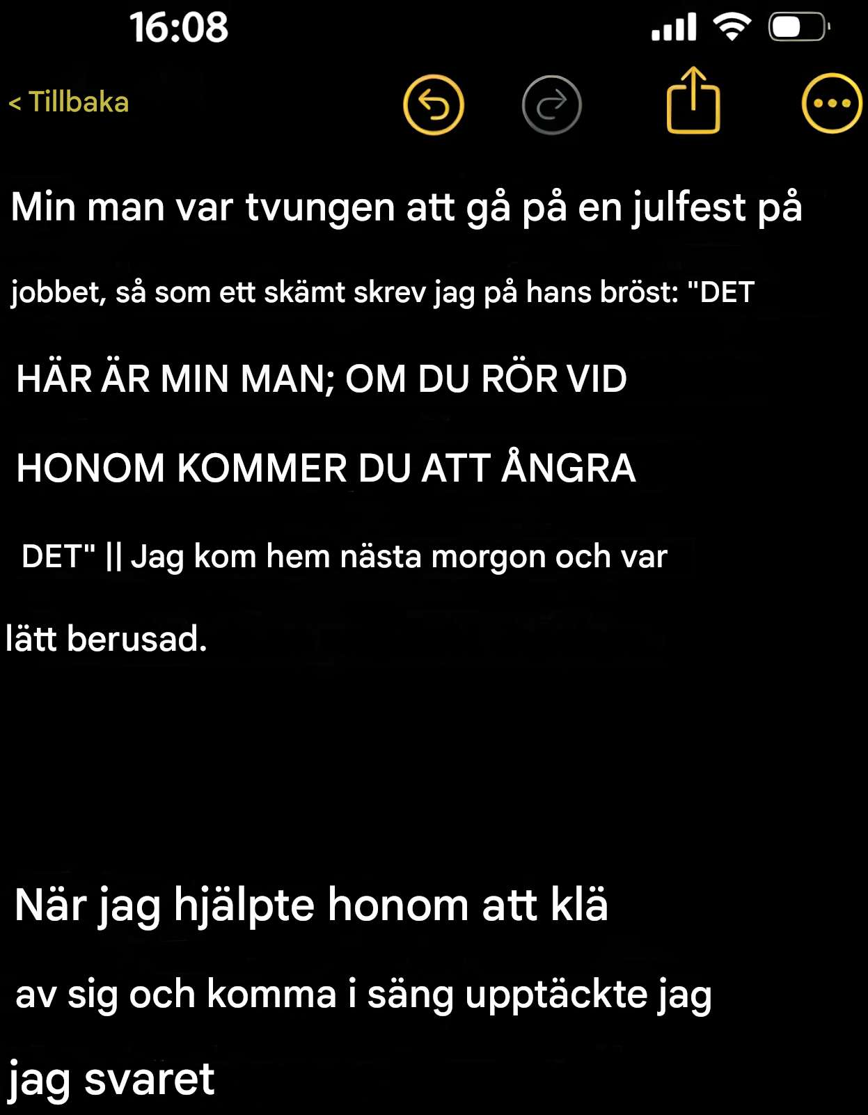 Jag tittade på honom och visste att han var full. Jag gick med honom till vårt rum med avsikt att klä av honom och lägga honom i sängen. Men medan jag hjälpte honom att klä av sig fick jag svar på mitt vaga meddelande.