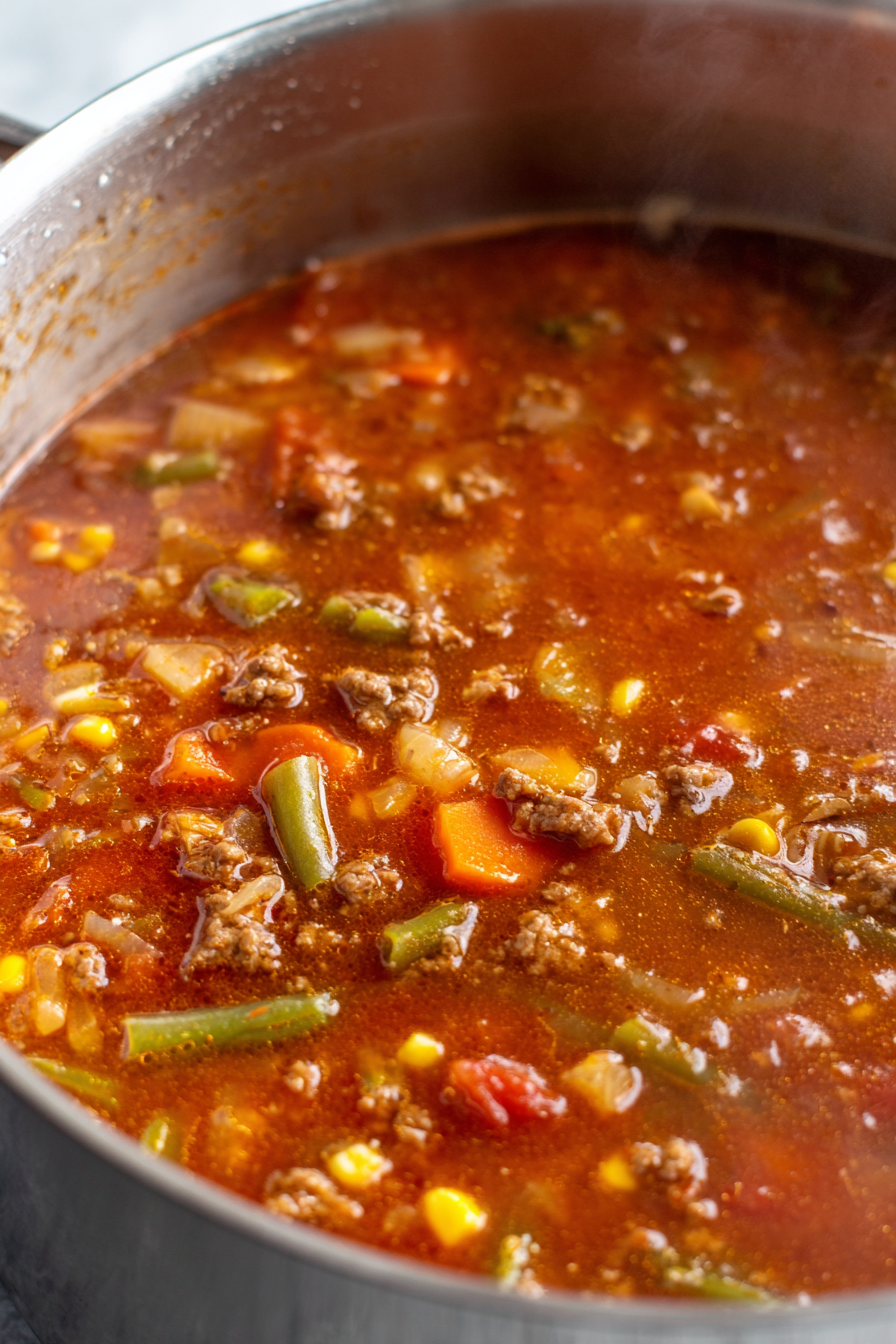 Sätt tillbaka kastrullen på spisen på medelhög värme. Tillsätt morötter, selleri, köttbuljong, konserverade tomater, potatis, gröna bönor, tomatpuré, worcestershiresås, italiensk krydda, salt och peppar. Rör ihop allt och låt sedan blandningen koka upp. När det kokar, sänk värmen till sjudning, täck över och låt det sjuda i cirka 25 minuter, eller tills potatisen och grönsakerna är mjuka.
