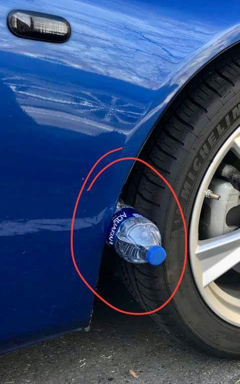 En sådan situation involverar en plastflaska som sitter fast mellan bilens däck och ram . Om du någonsin ser detta på ditt fordon, var uppmärksam och agera snabbt . Detta är inte ett ofarligt skämt – det kan vara ett tecken på ett försök till bilkapning . I ett sådant fall, ring 112 omedelbart .