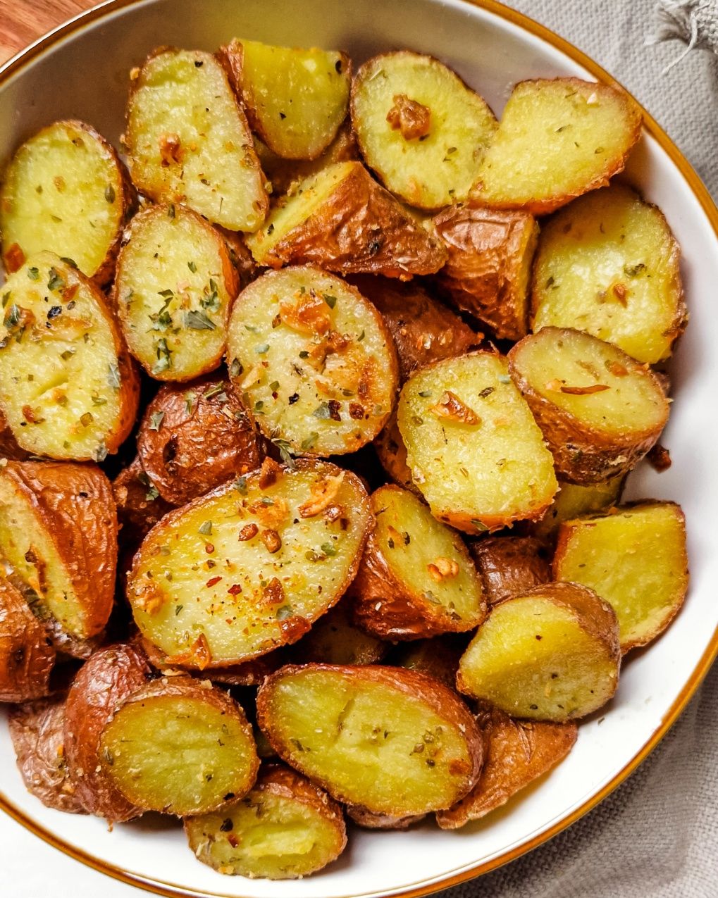 Jag använder en hel del vitlök och hackar det väldigt fint. Vitlöksbitarna blir krispiga i ugnen. Släng dem inte, servera dem även med potatisen.